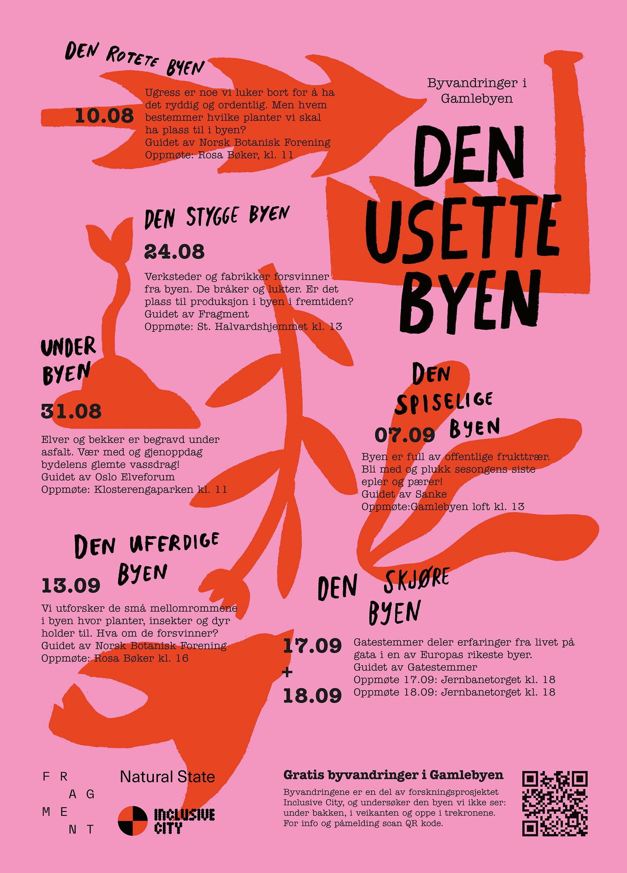 Poster (70x50) from the city walks "The Unseen City" organized by Fragment and Natural State as part of the research project Inclusive City funded by Driving Urban Transitions / Horizon Europe. Poster by Fragment.
